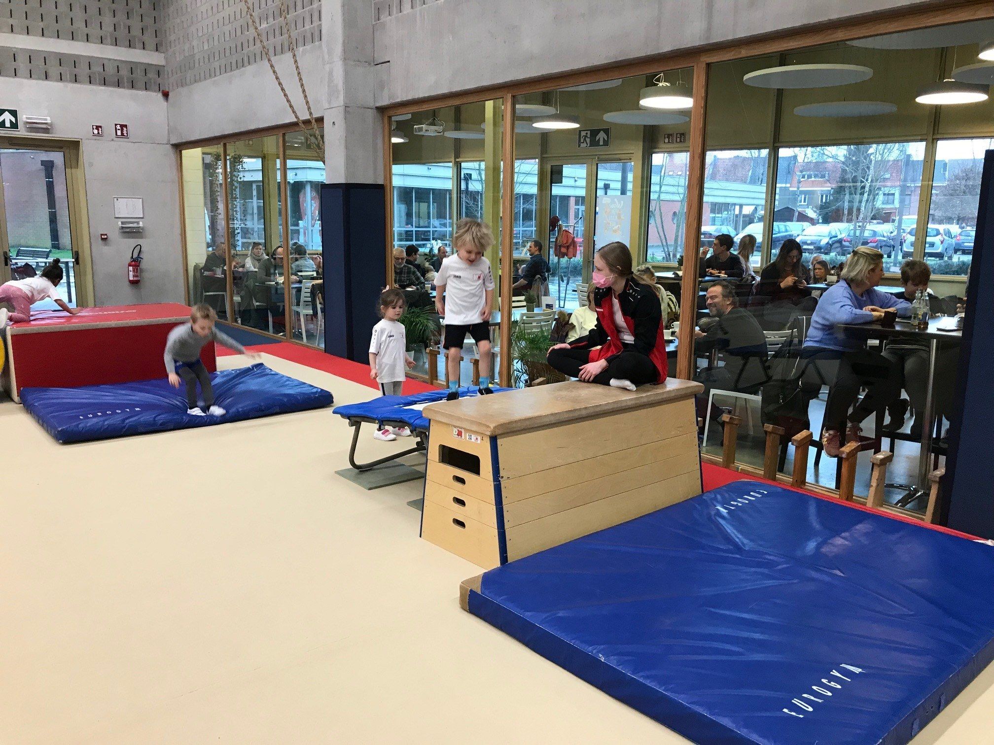 De gymhal heeft een totale oppervlakte van 938 vierkante meter en bevat verschillende zones. Er is een vrije zone - uitgerust met spiegels - die polyvalent gebruikt kan worden als bijvoorbeeld dansruimte. Deze zone kan afgeschermd worden van de rest van de gymhal door middel van geluidswerende gordijnen en vormt zo een aparte ruimte. Deze zone kan eveneens gebruikt worden voor recreatieve gymnastiek, kleuter- en peutergym, volleybal en andere zaalsporten.