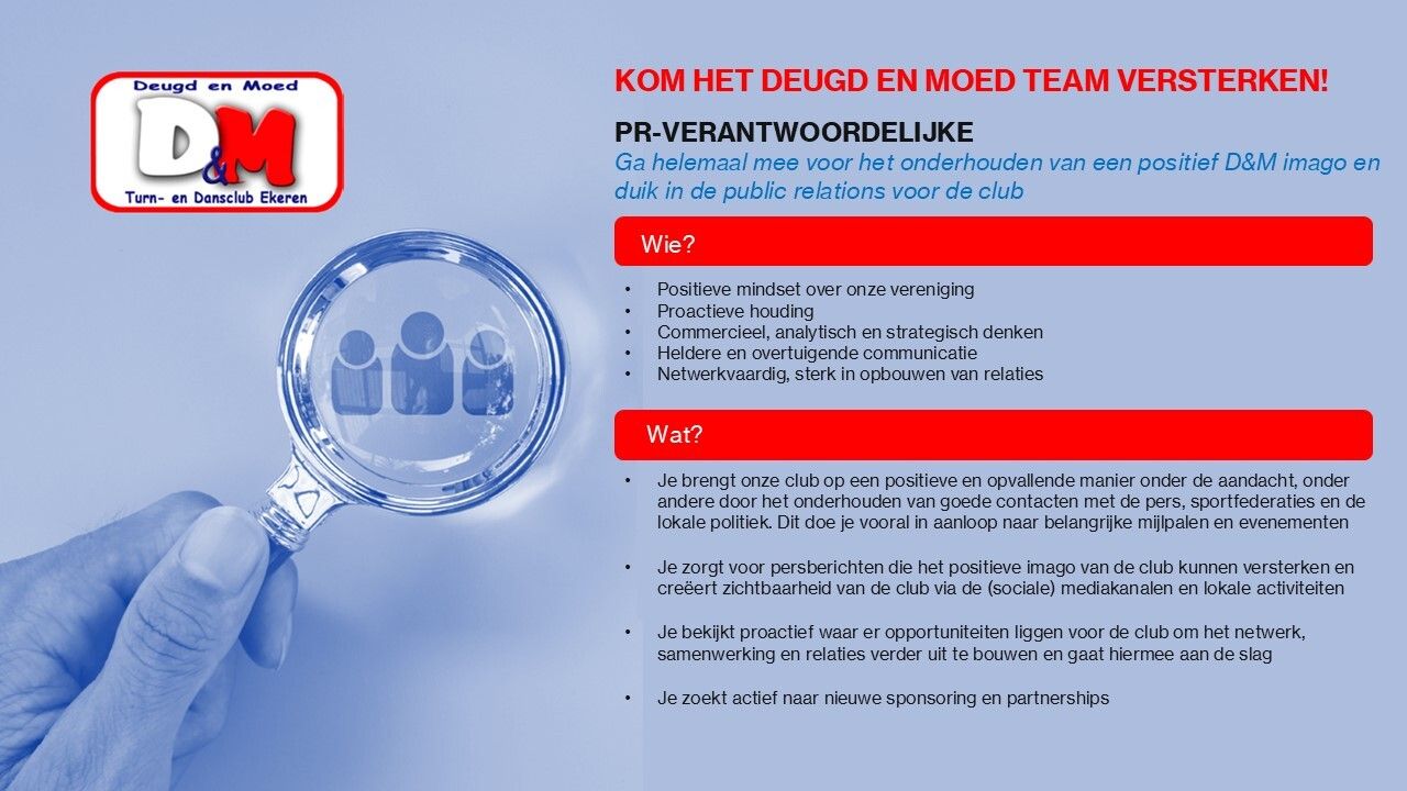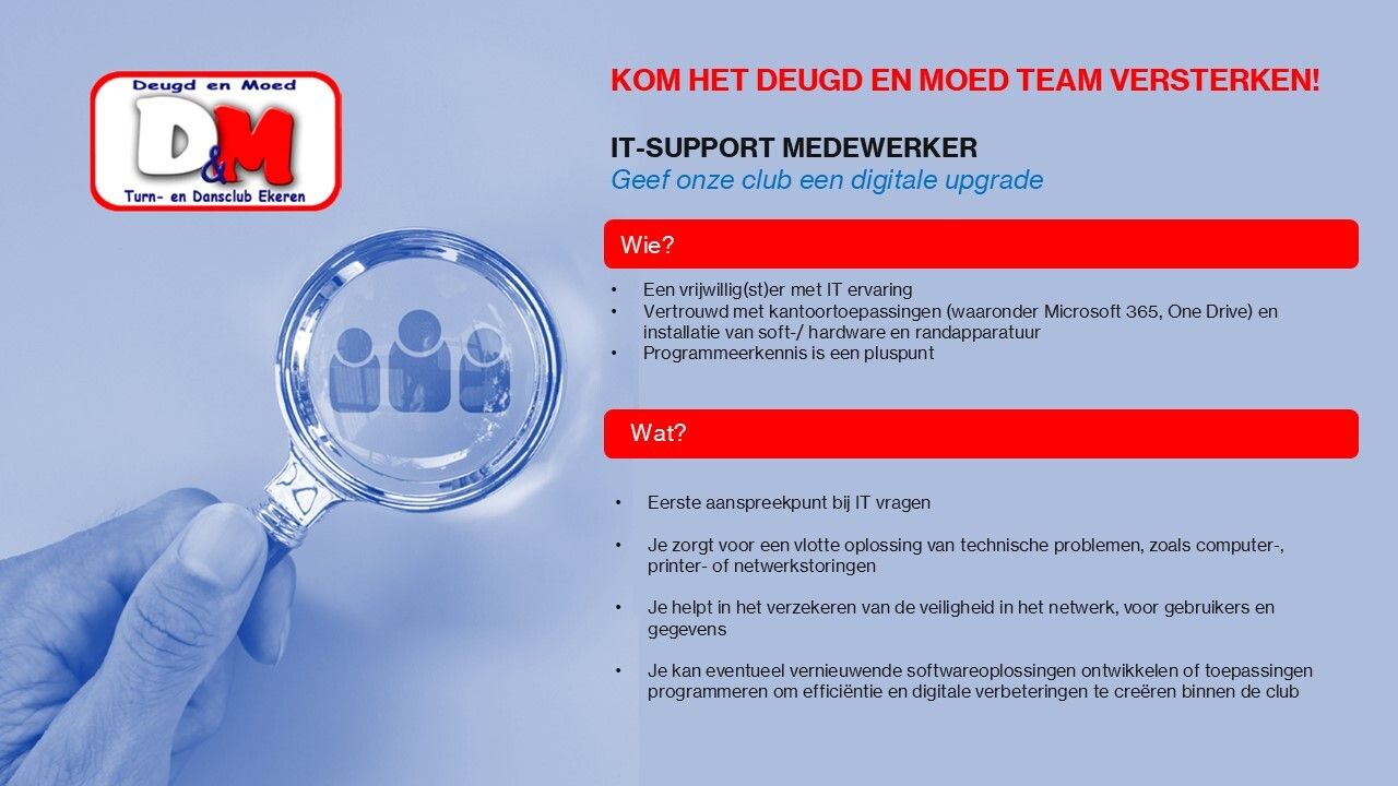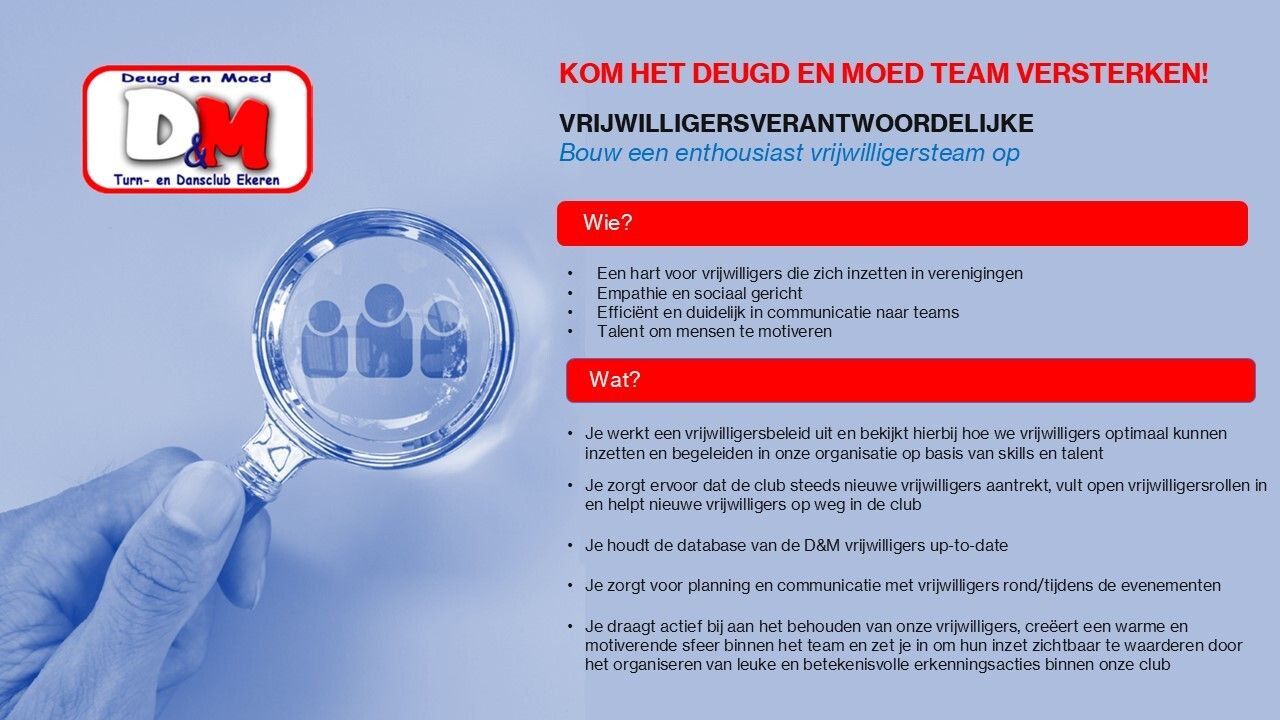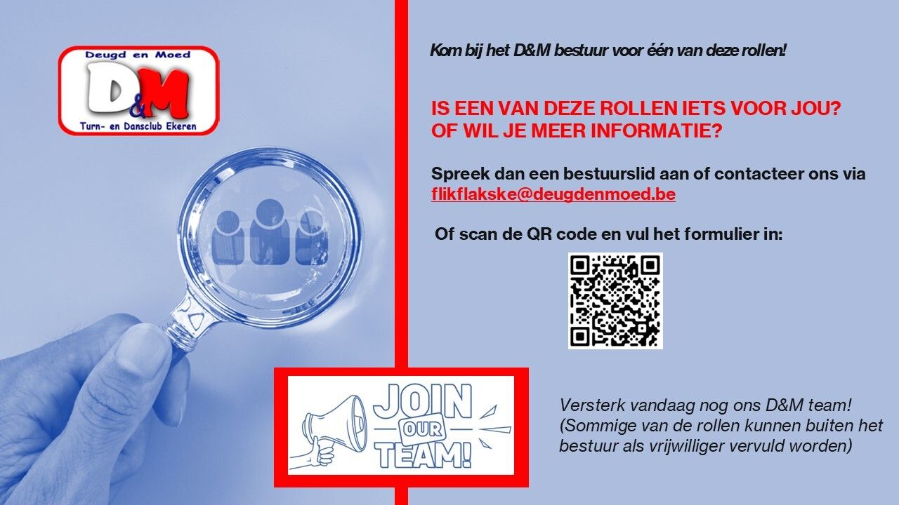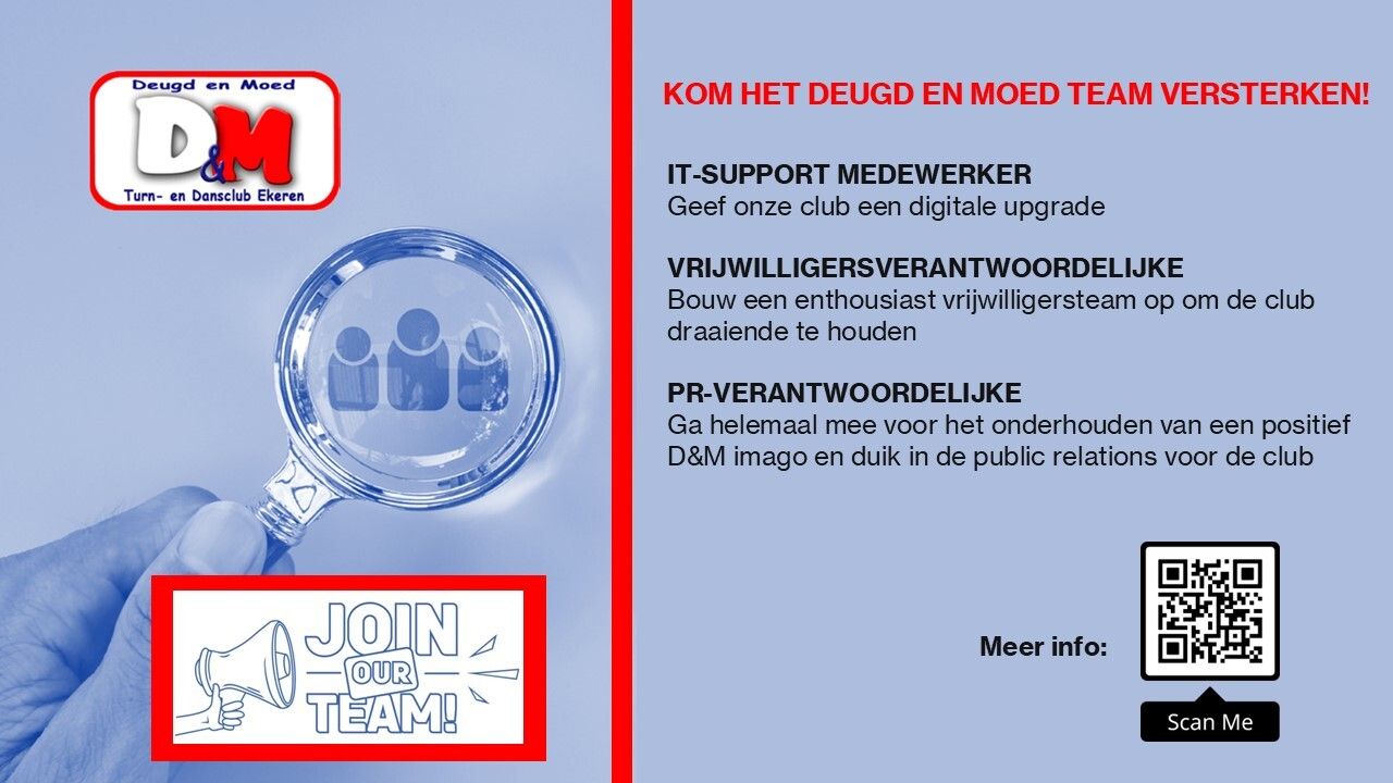 Als je op volgende punten volmondig "ja" kan antwoorden, stuur dan zeker een mailtje naar tim@deugdenmoed.be of piet@deugdenmoed.be met jouw naam, geboortedatum, telefoonnummer en de afdeling waarvoor je interesse hebt. We nemen dan spoedig contact met je op!
